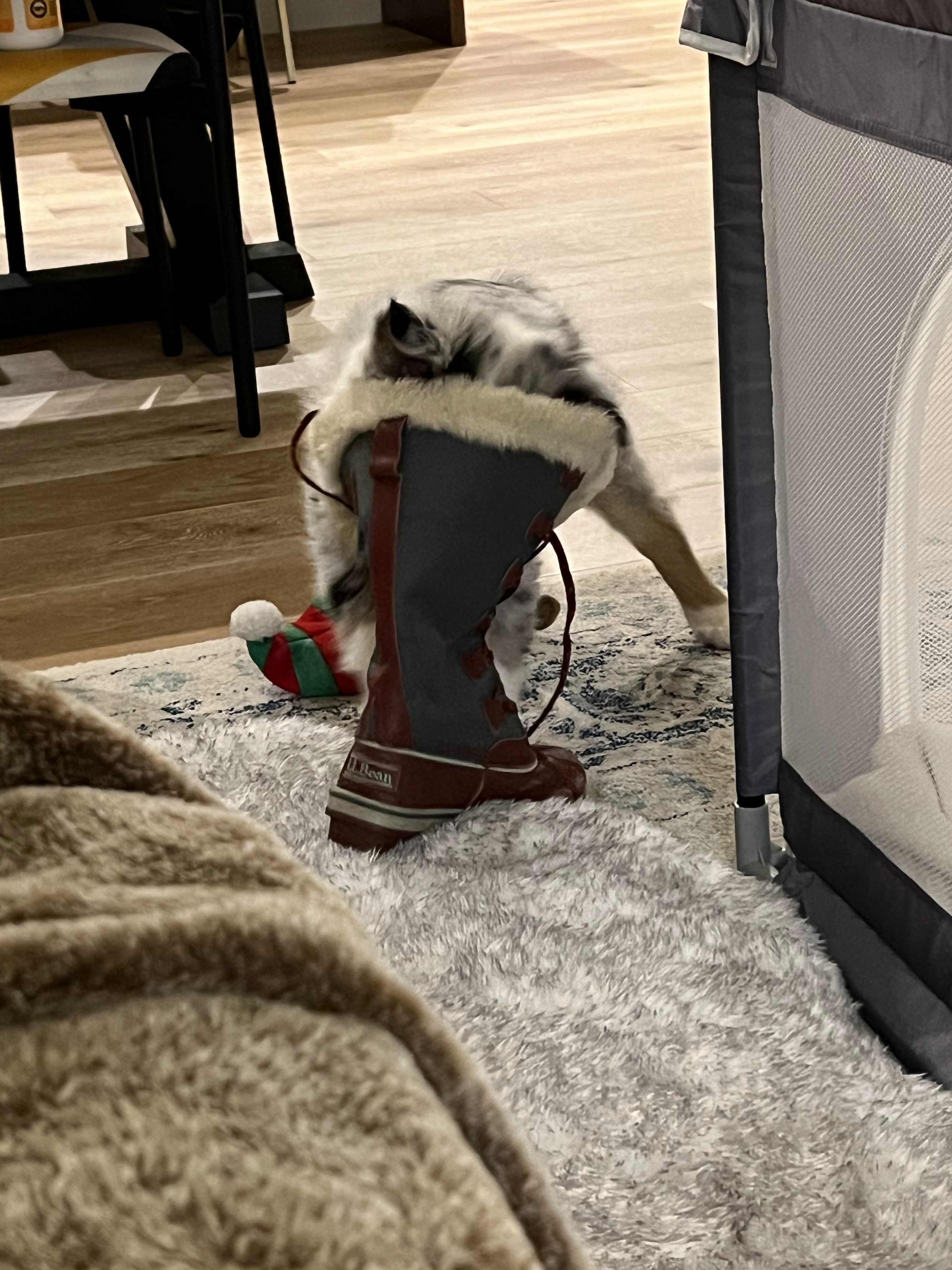 Maybe it’s not just my habit. Maybe it’s Maris herself… she is forever etched into our lives. As are traces of her in the house. I know that I did my best to clean out Maris’s things and put them into a bin a few months ago, but I had forgotten about a large wicker basket full of her toys under the piano. Of course, it took another dog to find dog toys. One day, I found Lucas running around the house with a giant centipede toy stuffed with squeakers. I panicked because I knew they were Maris’s… I guess I’m still not ready to be surprised by Maris’s memory. My initial reaction was to take it from him and put all of her toys away in the basement. But then he was so cute, this little puppy dragging a toy that was twice as long as he is, that I actually had to laugh. “Okay, Lucas. You can play with it. Grow into it.” The next day, he found Maris’s Nylabones, and her raccoon, and her Kong Wubbas. They are all too big for him, but he is enjoying his hand-me-downs.